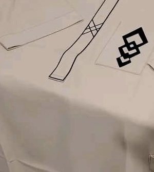 ............................................................................................................................................The top has a round neckline and a decorative placket running down the chest, highlighted by black geometric embroidery. A matching design appears on the left chest pocket, adding symmetry and style. The trousers complement the top with a similar embroidered motif on the pocket, creating a cohesive and refined look. The overall ensemble blends simplicity with cultural artistry.