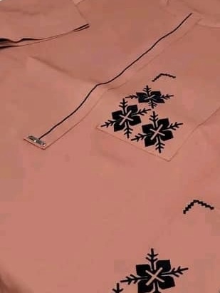 This is a traditional men’s tunic in soft pink, designed with striking black floral embroidery.