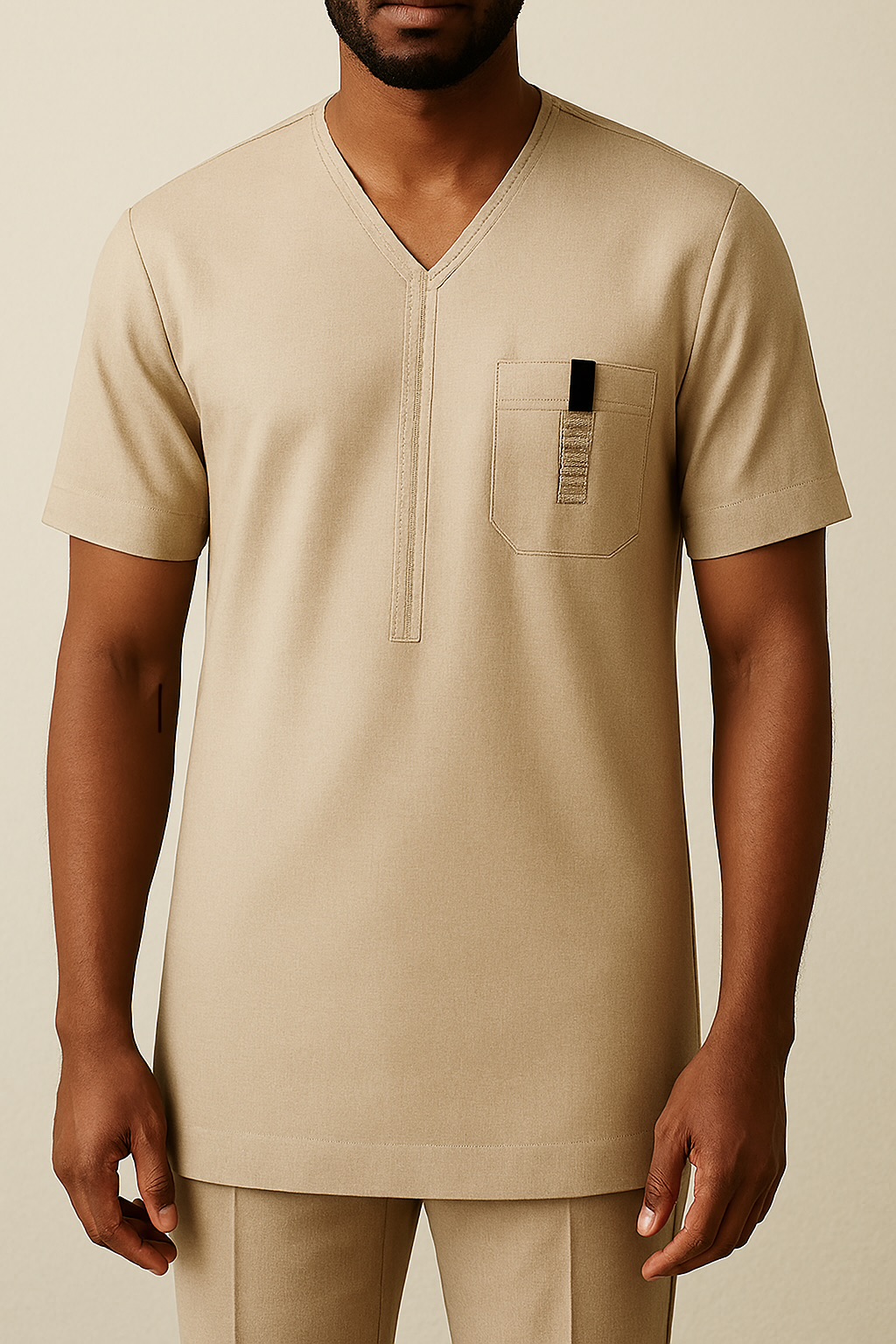 ............................................................................................................................................The short-sleeved shirt features intricate embroidery around the neckline and down the chest, forming a vertical decorative pattern. A pocket on the left chest is accented with a black and gold woven strip, adding contrast and detail. Matching trousers complete the ensemble, while the smooth, medium-weight fabric enhances its polished and cultural appeal.