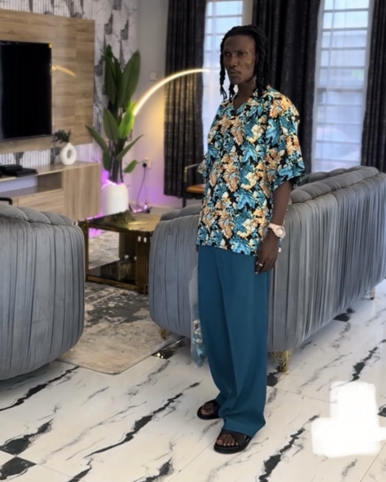 This outfit is lively and expressive, with a strong tropical vibe. The brightly colored floral shirt mixes shades of blue, yellow, and black, creating a bold, eye-catching pattern that immediately draws attention.