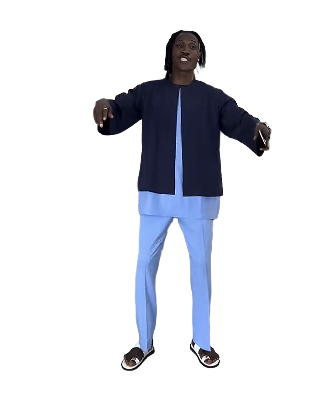 ............................................................................................................................................The base is a light blue tunic-style top paired with matching trousers, giving a clean, coordinated look with a soft, calming tone. Over this, the person wears a dark navy jacket or overcoat, which adds depth and contrast, making the lighter blue stand out more vividly. For footwear, the dark brown and white slip-on sandals keep the ensemble relaxed and approachable, balancing the more formal feel of the layered clothing. The overall effect is a mix of contemporary streetwear and traditional attire, stylish yet comfortable, with the extended arms pose adding a touch of confidence and flair. It’s a versatile look—equally fitting for cultural gatherings, casual social events, or even creative professional settings.