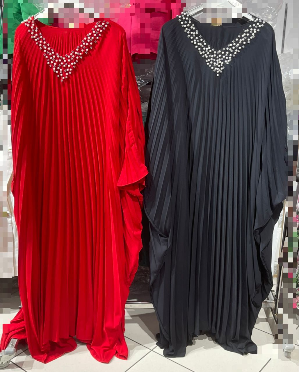 ............................................................................................................................................ ........................................................................................................................................Elegant full-length maxi dress with flowing vertical pleats from neckline to hem. V-shaped neckline richly adorned with pearl-like embellishments, creating a statement focal point. Sleeveless cut with a relaxed drape, offering both comfort and sophistication. Available in two striking color options: bright red for a bold, vibrant look, and classic black for timeless elegance.