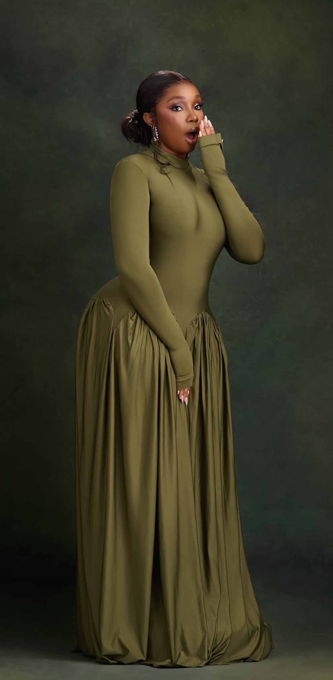 ............................................................................................................................................ ........................................................................................................................................This is a sophisticated, floor length gown. It’s a fitted bodice with a high neckline and long sleeves that extended seamlessly into glove-like cuffs, giving it a modern, sculpted look.The fabric appears smooth and slightly matte.