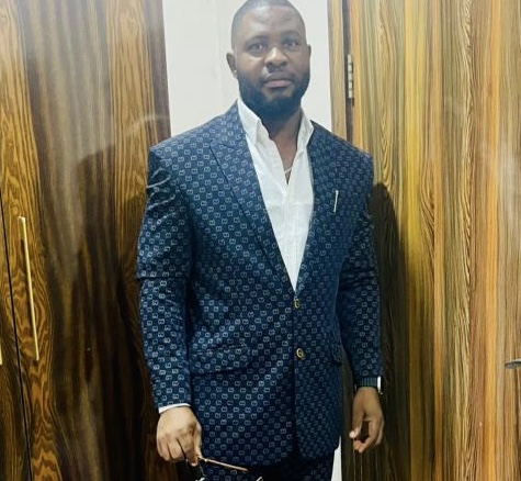 ............................................................................................................................................The individual is wearing a dark blue patterned suit featuring a subtle geometric design, paired with a crisp white shirt underneath. Black dress shoes add a polished finish, while a pen clipped to the jacket pocket introduces a practical touch. The person holds a pair of sunglasses, which adds a modern accessory to the ensemble. Overall, the outfit balances sophistication with understated flair.