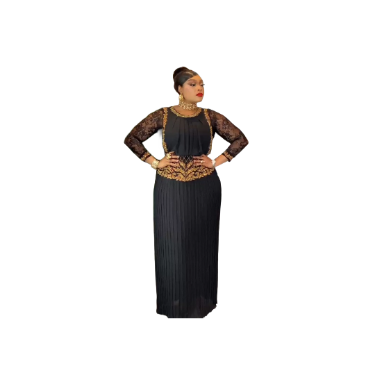 ............................................................................................................................................ ........................................................................................................................................Elevate your wardrobe with this sophisticated black embroidered dress, crafted for women who appreciate refined elegance and timeless style. This piece blends rich detailing, modern structure, and classic femininity—perfect for weddings, receptions, formal dinners, and premium social events. ✨ Design Highlights • Intricate Gold Embroidery The bodice features beautifully detailed gold embroidery that frames the neckline and waist, adding a luxurious, regal touch. • Sheer Lace Sleeves Long, transparent lace sleeves offer a graceful balance of modesty and allure, enhancing the dress’s overall sophistication. • Structured Bodice A fitted upper design shapes the silhouette beautifully, creating a flattering and elegant profile. • Pleated Lower Skirt The lower section flows into soft pleats, adding movement and refinement to the overall look. • Statement Accessories (Styled Look) Paired with bold gold earrings and a choker‑style necklace, the ensemble exudes confidence and high‑fashion appeal. ???? Why Shoppers Love It - Elegant blend of lace, embroidery, and structure - Perfect for formal and semi‑formal occasions - Flattering silhouette with premium detailing - A standout choice for women who love luxury, modest fashion