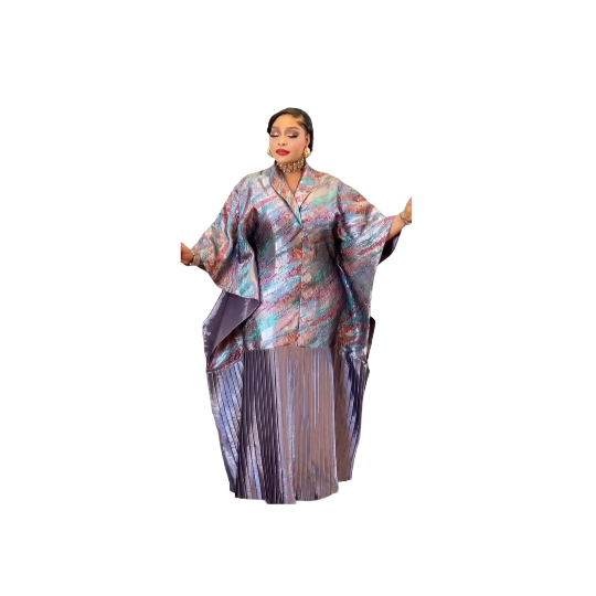 Command attention with this breathtaking iridescent metallic kimono‑inspired gown, designed for women who love dramatic silhouettes, luxurious fabrics, and modern artistic fashion. This statement piece blends flowing volume, shimmering color transitions, and couture‑level detailing—perfect for galas, high‑profile celebrations, fashion events, and premium occasions. Design Features • Iridescent Metallic Fabric The gown features a stunning blend of purple, blue, and pink metallic tones that shift beautifully with movement, creating a captivating, luminous effect. • Kimono‑Inspired Silhouette Wide, flowing sleeves and a relaxed upper drape give the outfit a regal, elevated presence while maintaining comfort and ease. • Sculpted Pleated Skirt The lower section transitions into a darker metallic pleated skirt, adding depth, texture, and graceful movement. • Dramatic Volume & Flow The generous cut and fluid fabric create a striking, fashion‑forward silhouette that stands out effortlessly. Why Shoppers Love It - Unique fusion of traditional kimono elements and modern couture flair - Eye‑catching metallic finish perfect for evening and special events - Comfortable yet luxurious design with dramatic visual impact - Ideal for women who love artistic, statement‑making fashion