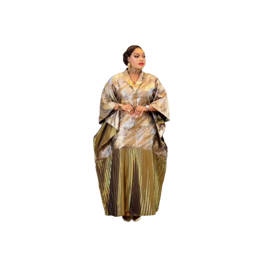 Radiate elegance and cultural sophistication in this metallic gold and silver kaftan gown, designed for women who love flowing silhouettes, premium fabrics, and timeless ceremonial style. This piece blends traditional charm with modern luxury, making it perfect for weddings, receptions, religious celebrations, and high‑profile events. ✨ Design Features • Shimmering Metallic Fabric Crafted from a luminous gold‑and‑silver blend, the fabric reflects light beautifully, giving the gown a rich, regal glow. • Flowing Kaftan Silhouette The loose, floor‑length cut with wide sleeves offers graceful movement and all‑day comfort while maintaining a luxurious, elevated presence. • Pleated Lower Section The pleated detailing adds texture, volume, and a couture‑inspired finish that enhances the gown’s overall elegance. • Coordinated Gold Accessories (Styled Look) Paired with a gold choker, earrings, and bracelets, the ensemble exudes refined sophistication and cultural richness. ???? Why Shoppers Love It - Perfect blend of traditional elegance and modern metallic luxury - Comfortable yet statement‑making for long events - Eye‑catching shimmer ideal for special occasions - A standout choice for women who love flowing, regal, and culturally inspired fashion