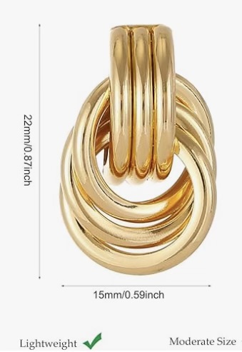............................................................................................................................................ ........................................................................................................................................• Material: Premium copper base with 14K gold plating. • Design: Looped, interwoven knot style that gives a chic and timeless appeal. • Dimensions: 22 mm (0.87 in) in height and 15 mm (0.59 in) in width. • Features: Lightweight, moderate in size, and hypoallergenic—making them comfortable for everyday wear and suitable for sensitive skin. These earrings strike a balance between sophistication and practicality. Their knot motif symbolizes unity and connection, while the gold finish ensures they can transition seamlessly from casual looks to more formal occasions.