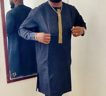 ............................................................................................................................................The base is a black attire richly decorated with gold embroidery, which gives it a regal and dignified appearance. The embroidery adds intricate detail, elevating the outfit from simple to ceremonial. The overall look is completed with a confident pose, which enhances the aura of pride and sophistication. Altogether, this attire communicates status, cultural pride, and style—perfect for occasions where tradition and fashion meet. The black-and-gold combination especially conveys authority and prestige