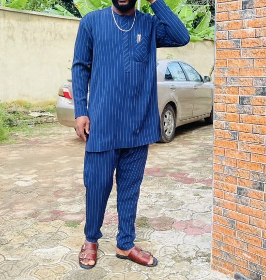 ............................................................................................................................................ ........................................................................................................................................The outfit is made from a blue pinstripe fabric, tailored in a traditional style. The material appears to be a soft, flowing textile that holds its shape well, giving the attire a neat and polished look. The vertical pinstripes add texture and subtle sophistication, making the fabric visually interesting without being overly bold. It’s paired with brown sandals, which complement the relaxed yet stylish feel of the clothing.